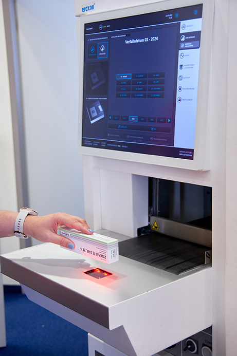- Die angelieferten Medikamente werden an einer Eingabestation eingescannt, anschließend hat der Apotheker die Möglichkeit Verfallsdaten einzugegeben. Über ein Förderband und mit einem Greifer wird die Ware in den Kommissionierautomaten transportiert und dort durch ein Handhabungsgerät an einem freien Lagerplatz entsprechend der Größe der Packung abgelegt.