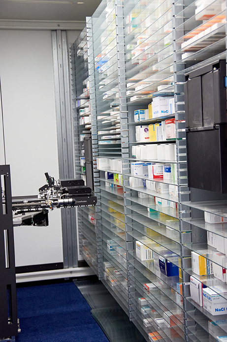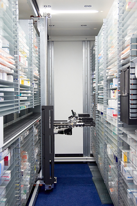 - Unser Kommissionierautomat transportiert die vom Personal via Warenwirtschaftssystem angeforderten Präparate aus dem Lager an den bedienenden Mitarbeiter. Durch den Einsatz dieses Automaten, kann die gewonnene Zeit zur Kundenberatung genutzt werden kann.